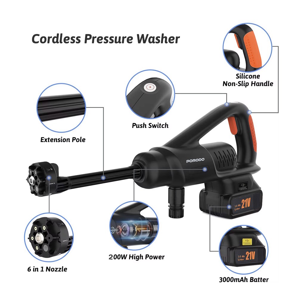 Elevate your car care routine with thePorodo Lifestyle 6-in-1 Car Washing Machine, designed to make vehicle cleaning faster, easier, and more efficient. Whether youre a car enthusiast or someone who simply wants to keep their vehicle spotless, this all-in-one solution offers powerful, versatile cleaning capabilities.FeaturesPowerful 200W Brushless MotorThis machine's high-performance 200W brushless motor operates at up to 18,000 RPM for unmatched cleaning power against tough dirt and grime. Perfect for removing mud or bird droppings, this motor delivers efficient, effective performance.6-in-1 Multi-Function Tool The Porodo 6-in-1 Car Washing Machine offers versatile spray options for various tasks, including gardening and outdoor cleaning. It can handle gentle surfaces and heavy-duty cleaning, making it a convenient all-in-one device.5M Water PipeWith a 5-meter hose, this washing machine provides ample reach for cleaning larger vehicles. Easily maneuver around difficult spots without moving the machine.Efficient 4.2Lmin Water Flow RateClean quickly with consistent flow. Get the job done faster while ensuring superior cleaning performance, whether you're rinsing off a large vehicle or washing a delicate surface.Rechargeable Battery The Porodo Car Washing Machine comes with a 3000mAh rechargeable battery that offers extended cleaning time without the need for a power outlet. Enjoy convenience while cleaning your car or other surfaces.Adjustable Speed ControlCustomize your cleaning experience with this feature by adjusting the motor's power for different surfaces and tasks. Save water and extend battery life by using only the necessary power.Versatile Spray TipsThe multi-spray tip system offers various modes for different cleaning needs, from gentle rinsing to heavy-duty grime removal.Porodo 6-in-1 Brushless Car Washing Machine with powerful 200W motor, adjustable speed, and multi-function spray tips. Featuring a long-lasting 3000mAh battery, 5-meter reach, and efficient water flow, this versatile, cordless washer is perfect for car cleaning and outdoor maintenance.Porodo 6-in-1 Brushless Car Washing Machine with powerful 200W motor, adjustable speed, and multi-function spray tips. Featuring a long-lasting 3000mAh battery, 5-meter reach, and efficient water flow, this versatile, cordless washer is perfect for car cleaning and outdoor maintenance.