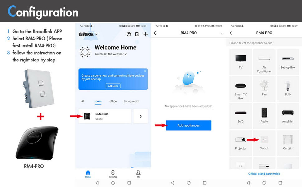 Set Up Hub Download and install the latest BroadLink APP, and sign up a BroadLink account. Power on the Broadlink RM4 Pro hub (not included sold separately) and make sure its in setup mode. Tap Add device in app and follow the wizard to add hub in app.