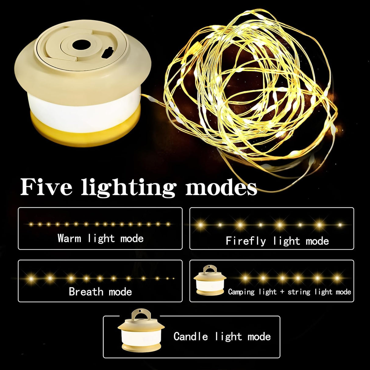 Multiple Lighting Modes Camping string lights outdoor with 5 adjustable lighting modes, including warm light, firefly light, breath light, lantern+ string lights and candle light mode. You can put out the hidden hook and hang it on a pole, tent or branch.