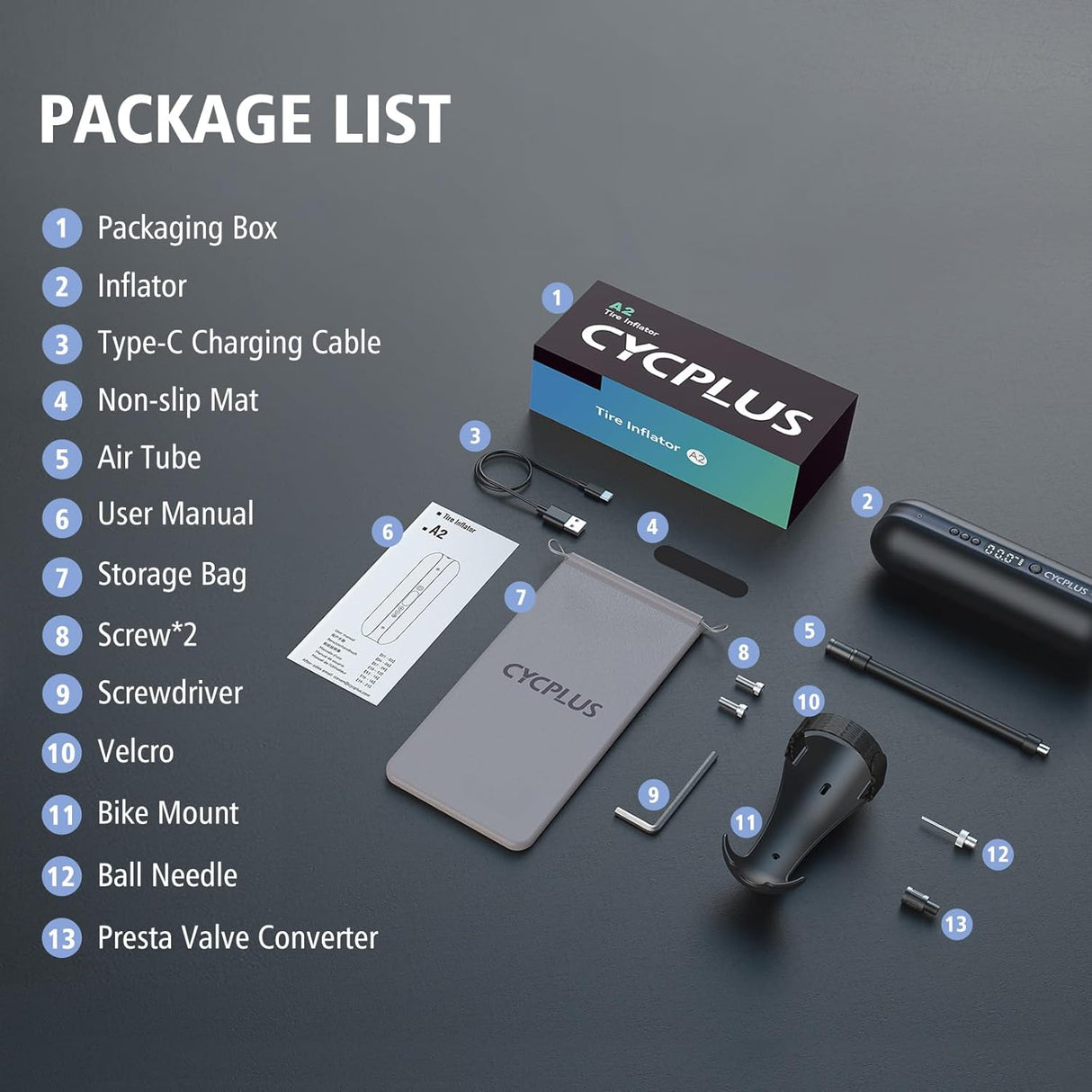 CYCPLUS A2 Pro Your All-in-One Portable Tire InflatorFeaturesPowerful and Versatile Inflate car, motorcycle, bike tires, and balls with ease! The CYCPLUS A2 Pro delivers maximum pressure of 150 PSI and includes Presta, Schrader valve adapters, and a ball needle for all your inflation needs.Compact Convenience Weighing only 380 grams and featuring a cordless design, the A2 Pro is your perfect on-the-go inflation companion. The included storage bag keeps everything organized for easy access.Fast and Efficient Tackle emergencies with ease. The A2 Pro inflates a car tire from 22 PSI to 36 PSI in just 3 minutes and a road bike tire from 0 to 120 PSI in 90 seconds.Safety and Security Set your desired pressure and let the auto-shutoff feature do the rest. No more overinflation! Plus, the built-in pressure gauge ensures you're always aware of your tire pressure.Multifunctional Marvel The A2 Pro is more than just a tire inflator. The integrated LED light provides illumination in low-light situations, and the USB-C input port doubles as a power bank to charge your mobile phone. Experience the CYCPLUS A2 Pro Difference Versatility, power, and convenience come together in this compact and portable inflator. Be prepared for anything with the CYCPLUS A2 Pro by your side.CYCPLUS A2 Pro Portable Tire Inflator Inflate car, motorcycle, bike tires, and balls with ease. This compact, rechargeable compressor features auto-shutoff, a pressure gauge, and an LED light. Perfect for on-the-go adventures.CYCPLUS A2 Pro Portable Tire Inflator Inflate car, motorcycle, bike tires, and balls with ease. This compact, rechargeable compressor features auto-shutoff, a pressure gauge, and an LED light. Perfect for on-the-go adventures.