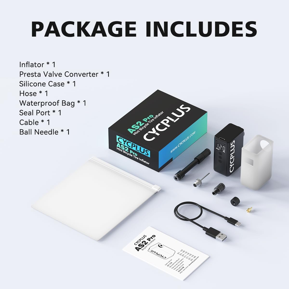 Experience the ultimate in portable tire inflation with the CYCPLUS AS2 Pro Mini. This powerful and compact pump packs a punch, delivering rapid inflation for your road, mountain, or e-bike tires.FeaturesUltra-Compact & Lightweight Weighing just120g and fitting in your pocket, the AS2 Pro Mini is the ultimate in portability. Take it anywhere, anytime!Blazing-Fast Inflation Don't let a flat tire slow you down. Inflate a 700 x 25C tire from 0-80 PSI in just 52 seconds, or a road bike tire in 120 seconds (0-120 PSI).Auto Shut-Off Set your desired pressure and let the AS2 Pro Mini do the rest. It automatically shuts off when the target pressure is reached, preventing overinflation.Large LED Display Easily monitor real-time pressure and pre-set values with the large, clear LED display.Max Pressure of 120 PSI Suitable for inflating tires for road bikes, mountain bikes, e-bikes, and city bikes.Universal Valve Compatibility Works with both Presta and Schrader valves, eliminating the need for adapters (adapter included for added convenience).Fast Charging Fully recharge the AS2 Pro Mini in just 1 hour. A single charge inflates at least three 700 x 25C tires from 0 to 120 PSI.All-Inclusive Kit Includes everything you need to get started, including a flexible hose, Presta valve adapter, ball needle, silicone case, waterproof storage bag, USB charging cable, and user manual.CYCPLUS AS2 Pro Mini Bike Pump Bicycle Tire Inflator, Inflate Your Tires Fast! Ultra-compact & lightweight. Inflates road & bike tires in seconds. Auto shut-off, LED display.Order now at Tradeo in UAE!CYCPLUS AS2 Pro Mini Bike Pump Bicycle Tire Inflator, Inflate Your Tires Fast! Ultra-compact & lightweight. Inflates road & bike tires in seconds. Auto shut-off, LED display.Order now at Tradeo in UAE!