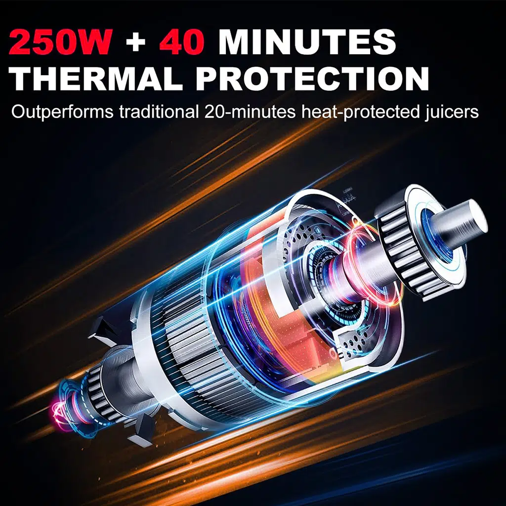 Maximize juice yield and retain essential nutrients with GreenLion's Slow Juicer. Uses 250W motor and masticating technology to gently crush, cut, and press ingredients for nutrient-rich juice.
