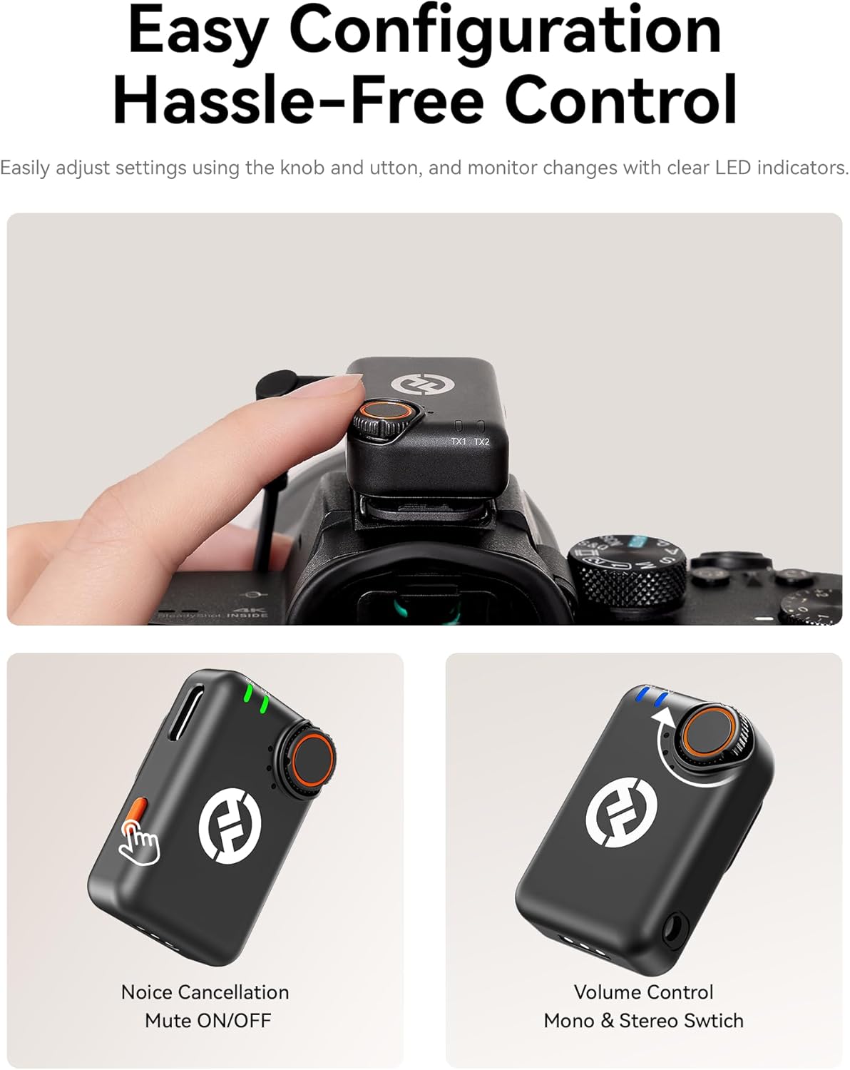 Improve your audio recording experience, record high quality audio with Hollyland Lark M2S wireless microphone. All in one microphone set works with iPhone, smartphone, camera and pc.FeaturesInnovative Titanium Clip-on DesignWith exceptional structural stability and durability, LARK M2S's innovative titanium clip-on design keeps your microphone securely in place, significantly enhancing the comfort and user experience, even during high-intensity activities like sports, cycling, or running.High-Fidelity, Capture Rich DetailCapture rich details with 24-bit48kHz sampling rate for crystal-clear, natural audio. A 70dB SNR minimizes background noise, while the 116dB SPL ensures low distortion for loud sources. Create professional, true-to-life recordings effortlessly.Noise Cancellation & Long-Range StabilityAdvanced ENC technology removes low-frequency noise for polished audio. Easily adjust 2 noise cancellation levels via the Lark Sound App. With a 300m (1000ft) MAX range and RF interference-resistant circuit, it provides stable, pristine sound quality even in signal-dense locations like event venues and busy urban areas.30H Long Battery PowerEnjoy 9 hours of working time per transmitterreceiver (noise cancellation off) with a quick 1.5-hour recharge. The charging case adds 2.5 full charges, delivering up to 30 hours of total battery life to keep you powered for all-day creativity and productivity.Universally Compatible, Effortlessly FlexibleLARK M2S works with cameras, audio equipment, iOSAndroid devices, and WindowsMac computers via 3.5mm analog and USB-C digital outputs. Enjoy plug-and-play recording on mobile devices with no need to unplug for playbackperfect for vlogger, creators, on the go!Easy Control & MonitoringSimplify your recording experience with the Lark Sound App. Check battery life, adjust volume, monitor connections, and fine-tune noise cancellation levels to meet your recording needs effortlessly.Everything IncludedLARK M2S Combo version includes 2x Pearl-sized TX, 1x Camera RX, 1x Type-C RX, 1x Type-C to Lightning Cable, 1x Charging CaseLark M2S Combo offers High-quality sound, advanced noise cancellation, long-range stability, and a 30-hour battery life. Compatible with smartphones, cameras, and PCs, its perfect for creators, vloggers, and on-the-go recording.Lark M2S Combo offers High-quality sound, advanced noise cancellation, long-range stability, and a 30-hour battery life. Compatible with smartphones, cameras, and PCs, its perfect for creators, vloggers, and on-the-go recording.