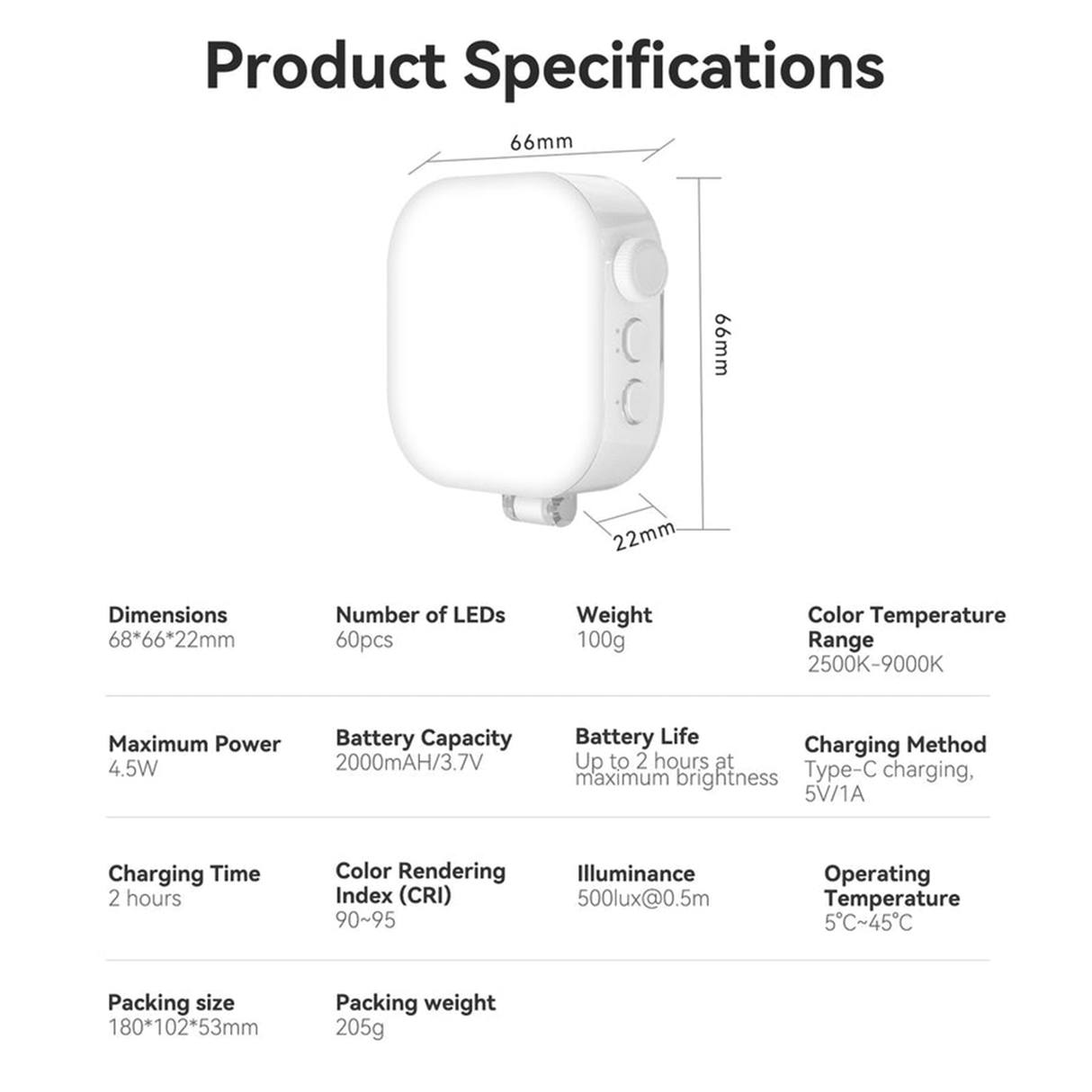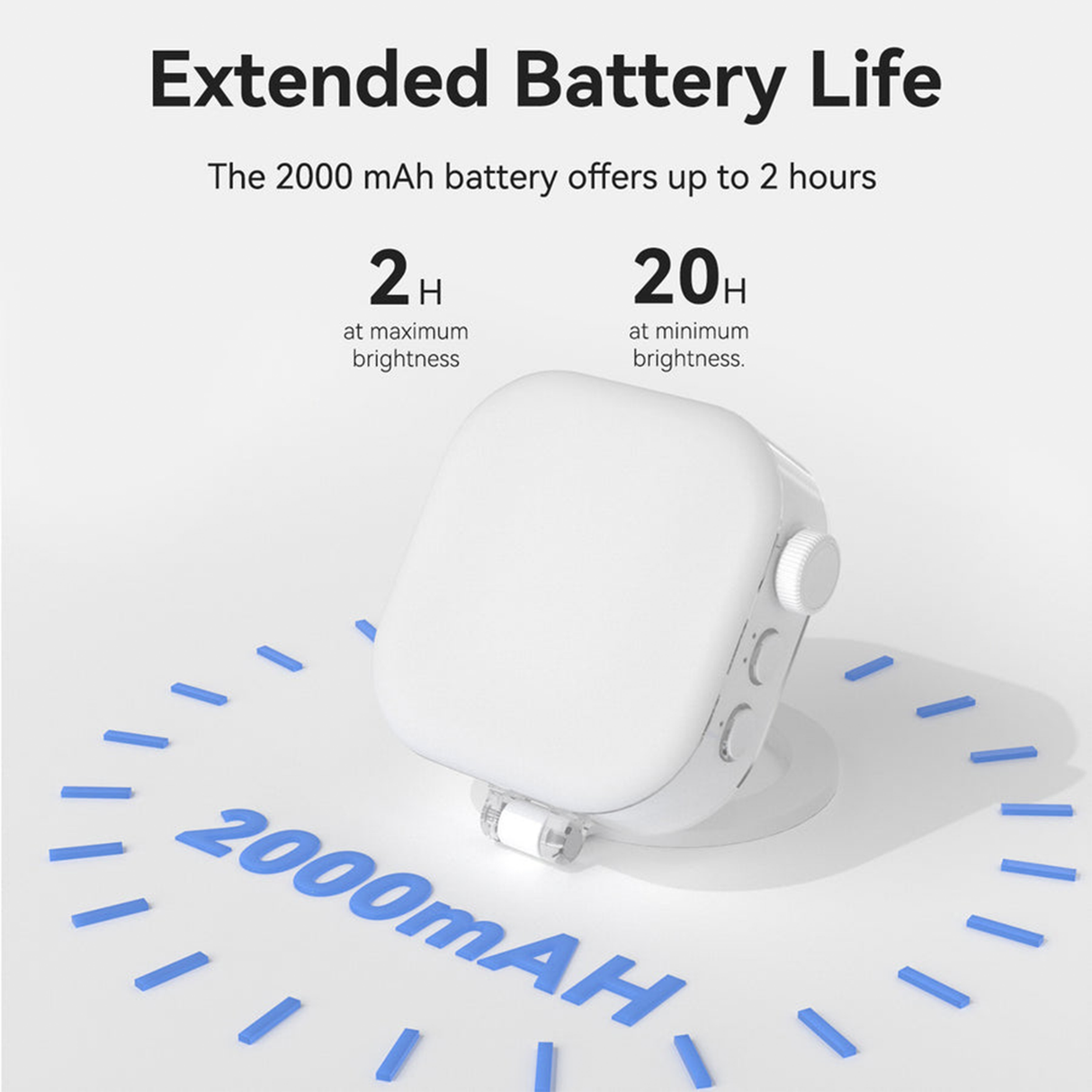 2000mAh rechargeable battery gives up to 2 hours at max brightness; ultra-lightweight (100g) and compact enough to fit in any pocket or creator bag.