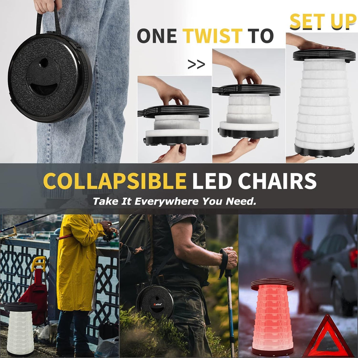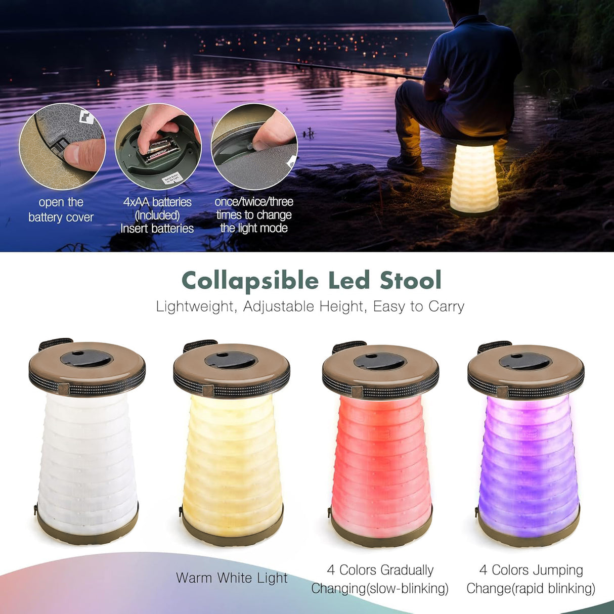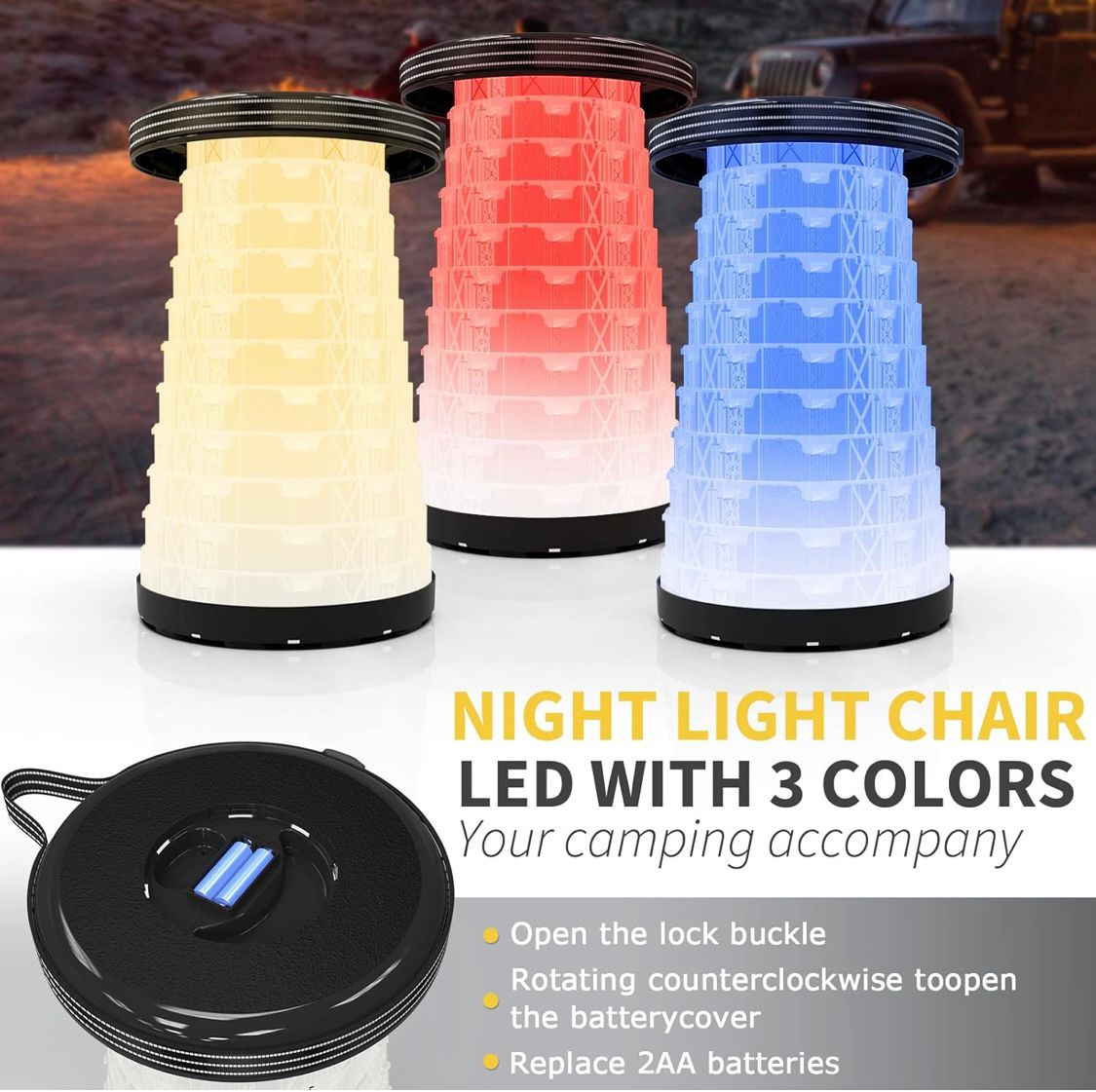 The telescopic stools feature built-in lamp beads with 3 lighting modes (Warm Light, RGB Breathing, and SOS) for practical illumination and ambiance.