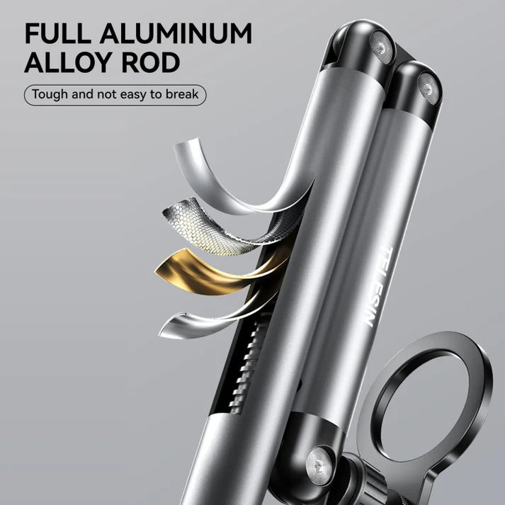 Experience the next level of hands-free convenience with the TELESIN P3-DS-02 Magnetic Desktop Phone Holderthe perfect solution for live streaming, video conferencing, and content creation. With a sleek magnetic design, durable materials, and pro-level flexibility, this mount delivers unmatched stability and style for your desktop setup.FeaturesMagnetic One-Hand MountingEquipped with ultra-strong N52 magnets, this stand offers instant, secure attachment for iPhones with MagSafe or other phones using the included magnetic ring. No clunky clipsjust tap and go.360 Adjustable Viewing AngleThe innovative two-way damping pivot allows full 360 rotation and smooth tilt control. Easily switch between vertical, horizontal, or diagonal views to get the perfect angle for every shot, video, or call.Rock-Solid StabilityCrafted with a weighted metal base and EVA anti-slip padding, the mount stays firmly in placeeven during screen taps or angle adjustments. Ideal for desks, studio setups, or bedside tables.Premium Build QualityMade with a high-grade aluminum alloy pole, a full metal shaft, and a durable powder-coated finish, this stand supports devices up to 1.5kg (3 lbs) without bending or wobbling.Tablet & Phone CompatibleMore than just a phone standit's also compatible with iPads and tablets. Use it for video streaming, FaceTime, digital drawing, or multitasking setups.14" Thread for Add-OnsExpand your setup with ease using the 14-inch threaded connector, compatible with lights, microphones, or additional accessories for professional-quality content.TELESIN P3-DS-02 Magnetic Mount Desktop Phone & Tablet Mount with 360 rotation, strong MagSafe grip, and adjustable heightperfect for streaming & video calls.TELESIN P3-DS-02 Magnetic Mount Desktop Phone & Tablet Mount with 360 rotation, strong MagSafe grip, and adjustable heightperfect for streaming & video calls.