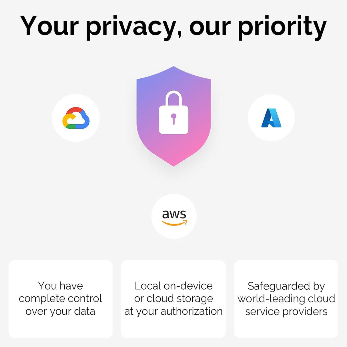 You have complete control over your data. Local on-device or cloud storage at your authorization. Safeguarded by the world's leading cloud service with top-tier encryption.