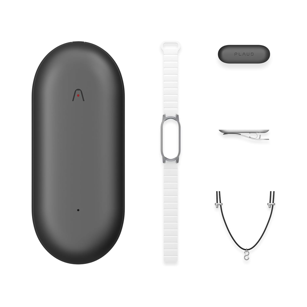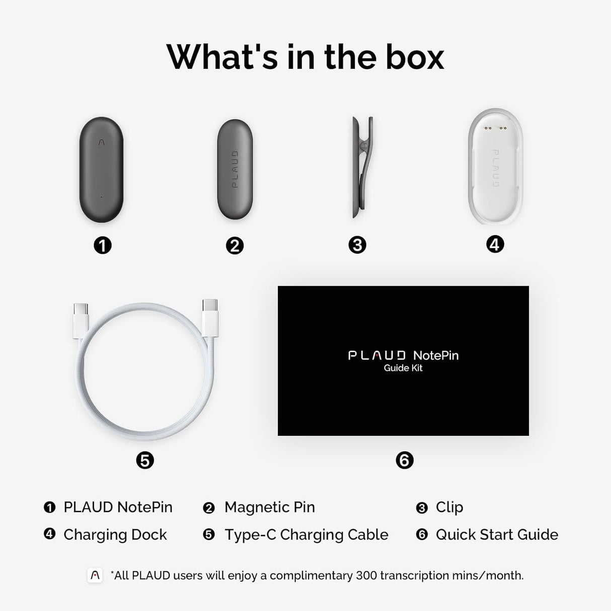 1 PLAUD NotePin Voice Recorder, 1 Black Lanyard, 1 White Wristband, 1 Silver Clip, 1 Charging Dock, and 1 USB-C Charging Cable. All PLAUD users will enjoy a complimentary 300 transcription minsmonth.