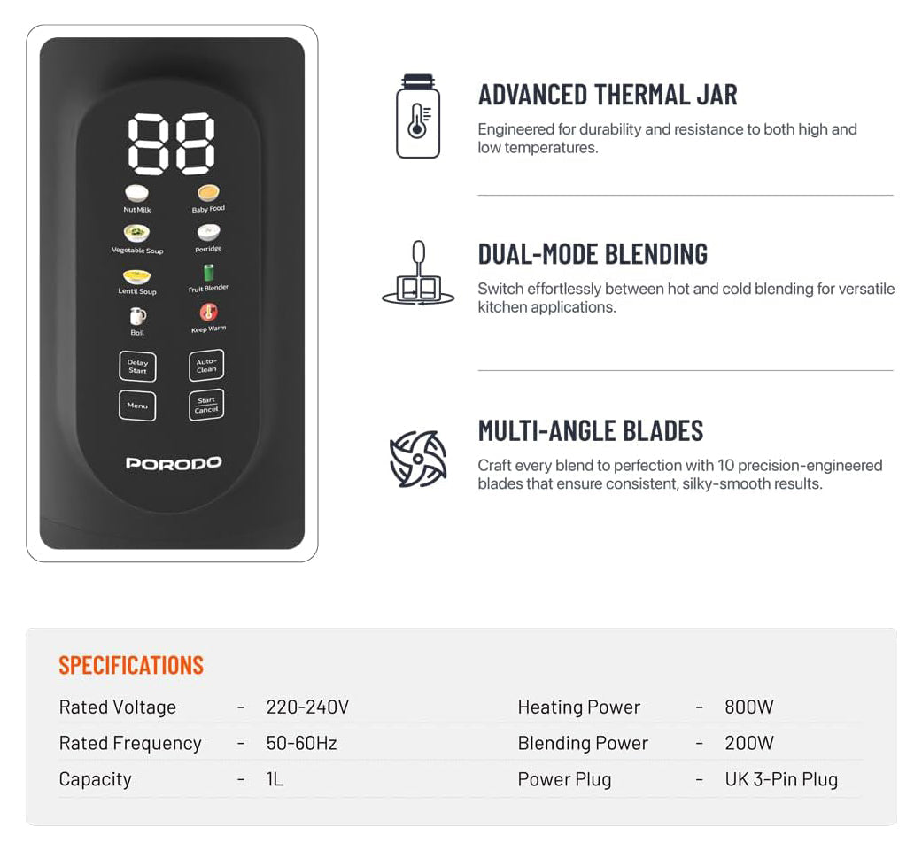 The Porodo 1L Auto Hot and Cold Drink Maker provides versatility with its dual-mode blending feature and stainless steel blades, offering an ideal solution for both hot and cold beverages. Its advanced thermal jar and digital display enhance convenience, making it an excellent addition to any kitchen.Features800W PowerEquipped with an 800W motor for efficient and quick blending of both hot and cold drinks.1000ml CapacityFeatures a 1000ml capacity to prepare generous portions of your favorite beverages, perfect for individuals or small groups.Digital DisplayThe digital display allows for easy operation and precise control of settings for an enhanced user experience.Advanced Thermal JarIncludes an advanced thermal jar to maintain the ideal temperature for hot drinks or keep cold beverages cool.Dual-Mode BlendingOffers dual-mode blending, enabling you to switch between hot and cold drink preparation effortlessly.Stainless Steel BladesStainless steel blades ensure durability and efficient blending, providing smooth, consistent results every time.Multi-FunctionPureed soup, chunky soup, cold soup, compote, smoothies, and thanks to optimized heating profile, milk based soup .Plus, use it can self-cleaning and keep warm.100% SafetyBoil-over sensor and water level sensor for foolproof, reliable performance. Temperature sensor enables precise and optimal temperature control during grinding and heating.Noise Reduction DesignThe auto hot and cold drink maker is equipped with noise reduction; there are less noise to be produced when the machine are working, providing a comfortable environmentAuto Clean with A ClickThis machine is designed with cleaning function that you just need to click the function key to clean the machine easily, saving your timeNo FilteringThe soybean milk is equipped with 10 pieces stainless steel cutter that make the soy milk more aroma and delicate and less residue; you can enjoy the soybean milk directlyDiscover the Porodo 1L Auto Hot and Cold Drink Maker with Digital Display. With a 1000ml capacity, 800W power, and easy-to-use features like auto-clean and noise reduction, it's perfect for making smoothies, soups, soy milk, and more.Discover the Porodo 1L Auto Hot and Cold Drink Maker with Digital Display. With a 1000ml capacity, 800W power, and easy-to-use features like auto-clean and noise reduction, it's perfect for making smoothies, soups, soy milk, and more.