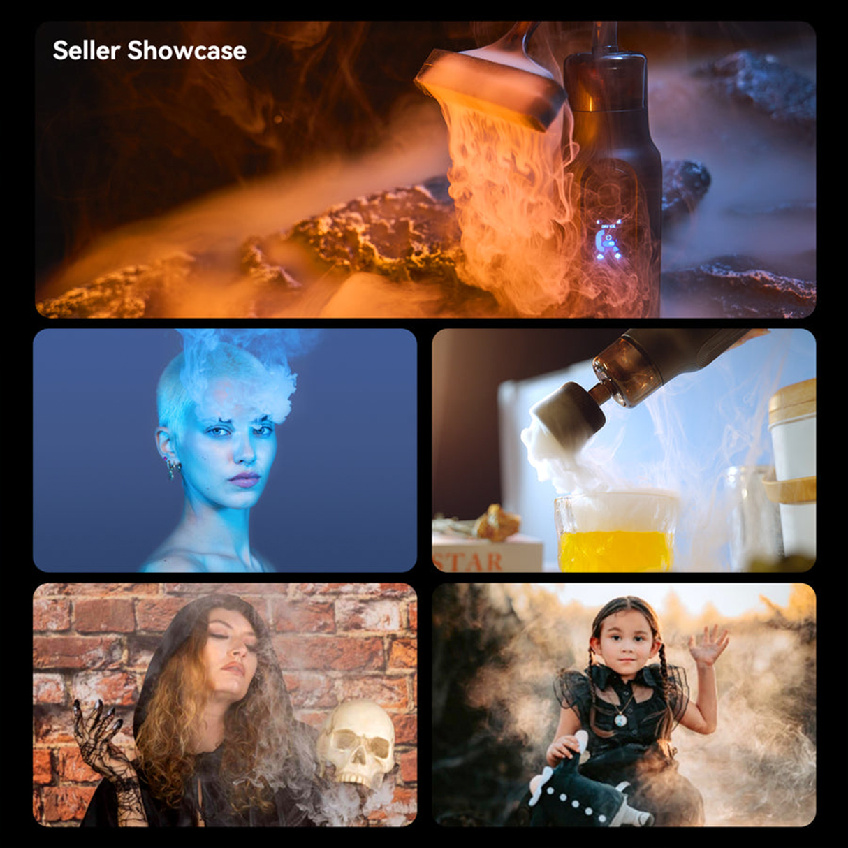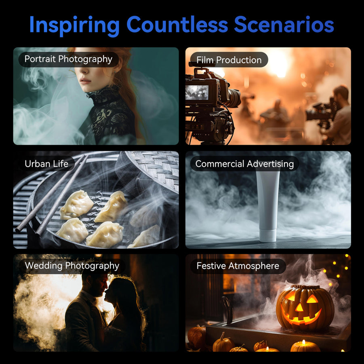 It delivers a variety of fog effects using interchangeable nozzles and includes remote control for hands-free operationFeaturesVersatile Scene UsePerfect for portraits, cinematic shots, weddings, food photography, events, Halloween, and more.Customizable Smoke Effects Includes multiple nozzle types (straight, bent, T-tube, and cotton sleeve) for a range of fog effectsfrom dry ice simulation to full-room atmosphere.Remote Control Operation Adjust fog output and direction remotely, ideal for discreet creative work without interrupting your shoot.Compact & Powerful40W handheld design delivers professional-grade smoke in a mini, portable form factor.Quick Setup & Easy UseUser-friendly design allows rapid deployment for both indoor and outdoor environments.Handheld 40W smoke machine with remote control and multi-nozzle options. Perfect for photography, video shoots, Halloween, parties, and event fog effects. Create dramatic visuals anywhere.Handheld 40W smoke machine with remote control and multi-nozzle options. Perfect for photography, video shoots, Halloween, parties, and event fog effects. Create dramatic visuals anywhere.
