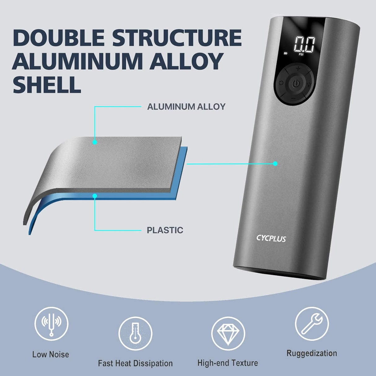 CYCPLUS A8 Portable Tire Inflator You're On-the-Go Inflation SolutionFeaturesPowerful Performance The CYCPLUS A8 delivers exceptional pressure up to 150 PSI, accommodating both Presta and Schrader valves. With a precision of 0.1 BAR, you can accurately monitor and maintain optimal tire pressure for a safe and smooth ride.Versatile Inflation Choose from four preset modes to effortlessly inflate car, motorcycle, bicycle tires, and even balls. The A8's intuitive pressure unit conversion between PSI, KPA, BAR, and KGCM ensures compatibility with various applications.Smart and Safe The A8's digital LCD screen provides real-time pressure readings for easy monitoring. The automatic shut-off feature prevents overinflation, ensuring safety and preserving the life of your tires.Portable and Convenient The cordless design and compact size of the A8 make it easy to carry on your travels or store in your vehicle. The included storage bag keeps everything organized and accessible, so you're always prepared for unexpected tire pressure issues.LED Flashlight It comes with build-in flashlight for emergency nighttime convenience use.Experience the CYCPLUS Difference With its powerful performance, versatility, and user-friendly features, the CYCPLUS A8 is the ideal portable tire inflator for anyone seeking convenience and reliability on the go.CYCPLUS A8 Portable Tire Inflator Inflate car, motorcycle, bicycle tires, and balls with precision. This cordless, rechargeable compressor features a digital LCD screen, automatic shut-off, and multiple pressure units. Perfect for on-the-go adventures.CYCPLUS A8 Portable Tire Inflator Inflate car, motorcycle, bicycle tires, and balls with precision. This cordless, rechargeable compressor features a digital LCD screen, automatic shut-off, and multiple pressure units. Perfect for on-the-go adventures.