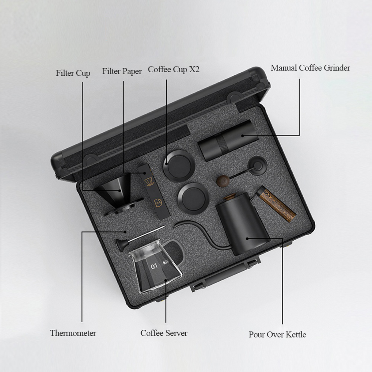 Includes up to 8 premium accessories such as filter cup, wood grain hand brewer, sharing pot, thermometer, grinder, filter paper, coffee cups, and elegant gift packaging.