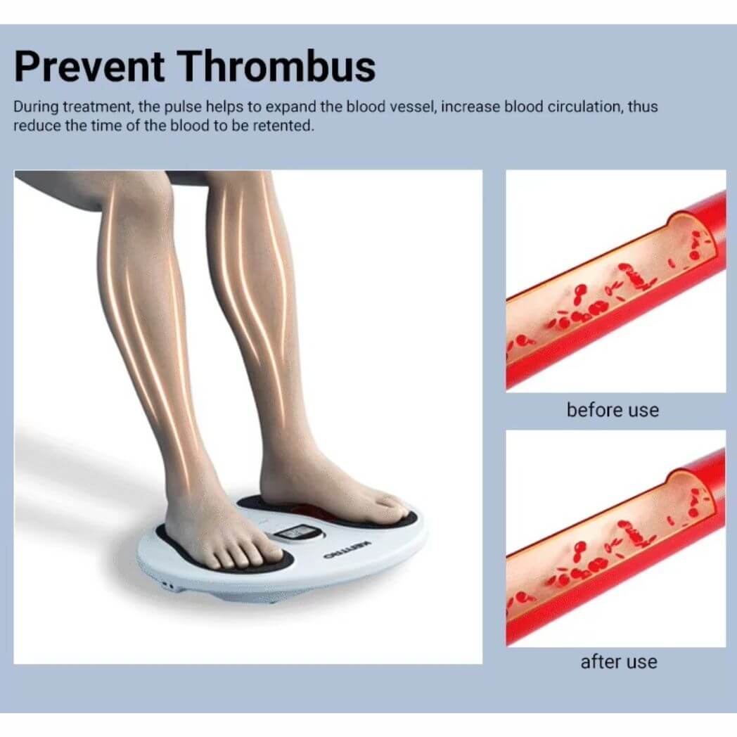 The KTR-4029 EMS Electric Foot Massager is a cutting-edge solution designed for anyone seeking relief from foot and leg discomfort. Combining advanced EMS (Electric Muscle Stimulation) and TENS (Transcutaneous Electrical Nerve Stimulation) technologies, it promotes better blood circulation, reduces pain, and alleviates swelling, making it an essential device for overall relaxation and recovery.FeaturesErgonomic and Portable DesignLightweight and equipped with a handle, this foot massager is easy to carry and store, making it perfect for home or travel.Innovative Electric Pulse TechnologyPatented electric pulse technology ensures powerful and effective massage force, targeting deep tissues to improve circulation and relieve discomfort.Customizable Massage ModesWith 9 massage modes and 20 adjustable intensity levels, it offers a tailored experience to meet your specific needs, whether youre looking for light relaxation or intensive therapy.User-Friendly Remote Control The included remote features a large LCD display with clear fonts, making it convenient for users with poor eyesight to adjust settings effortlessly.Rocking FunctionalityA unique design allows the massager to be rocked back and forth, enhancing the massage effect and comfort.BenefitsRelieves Pain and Fatigue Effectively reduces pain in legs, feet, and ankles caused by poor circulation, muscle tension, or other conditions.Improves Circulation Stimulates blood flow to oxygenate muscles, reducing cramps and swelling while supporting overall vascular health.Medical BenefitsAids in the healing of arterial and venous ulcers, particularly for diabetic patients.Helps prevent thrombosis and accelerates recovery for foot ulcers.Provides drug-free relief for medical conditions like osteoarthritis and diabetes-related circulation issues.With TENS + EMS technology, the KTR-4029 EMS Electric Foot Massager significantly boosts oxygen-rich blood flow to legs and feet, alleviating aches and pains while improving mobility.With TENS + EMS technology, the KTR-4029 EMS Electric Foot Massager significantly boosts oxygen-rich blood flow to legs and feet, alleviating aches and pains while improving mobility.