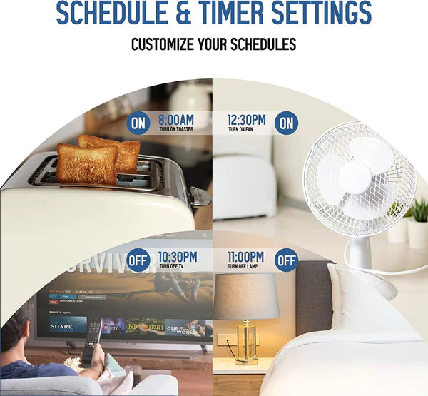 Use your voice assistant Alexa or Google Assistant to control lights, fans, coffee makers, and more. Just say "Alexa, turn on the lamp" or "Hey Google, turn off the TV."
