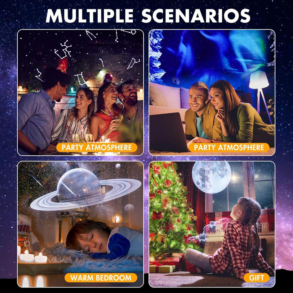 Device combining HD starry sky projection, white noise, Bluetooth music playback, and ambient lighting. With 360 rotation, a built-in timer, and wireless portability, it's perfect for enhancing sleep, relaxation, or home ambiance anytime, anywhere.FeaturesMulti-FunctionalityFunctions as a galaxy projector, Bluetooth speaker, white noise machine, night light, and meteor simulator with 360 rotation for immersive stargazing.HD Visual BrillianceProjects high-definition images using precision lens technology. Includes 6 light sheets Saturn, Moon, Earth galaxies, constellations, planets & Aurora Journey.Smart Timer Settings Simple 1-press system for 3060120-minute auto-off. Set your preferred sleep or ambience time easily.Wireless & PortableBuilt-in high-capacity rechargeable battery for cordless useideal for bedrooms, camping trips, or soothing a child to sleep anywhere.Galaxy Projector 6-in-1 HD starry sky projector with white noise, Bluetooth speaker, timer, and 360 rotation. Includes Aurora & planet visuals, portable and rechargeableideal for sleep, ambiance, and kids' rooms.Galaxy Projector 6-in-1 HD starry sky projector with white noise, Bluetooth speaker, timer, and 360 rotation. Includes Aurora & planet visuals, portable and rechargeableideal for sleep, ambiance, and kids' rooms.