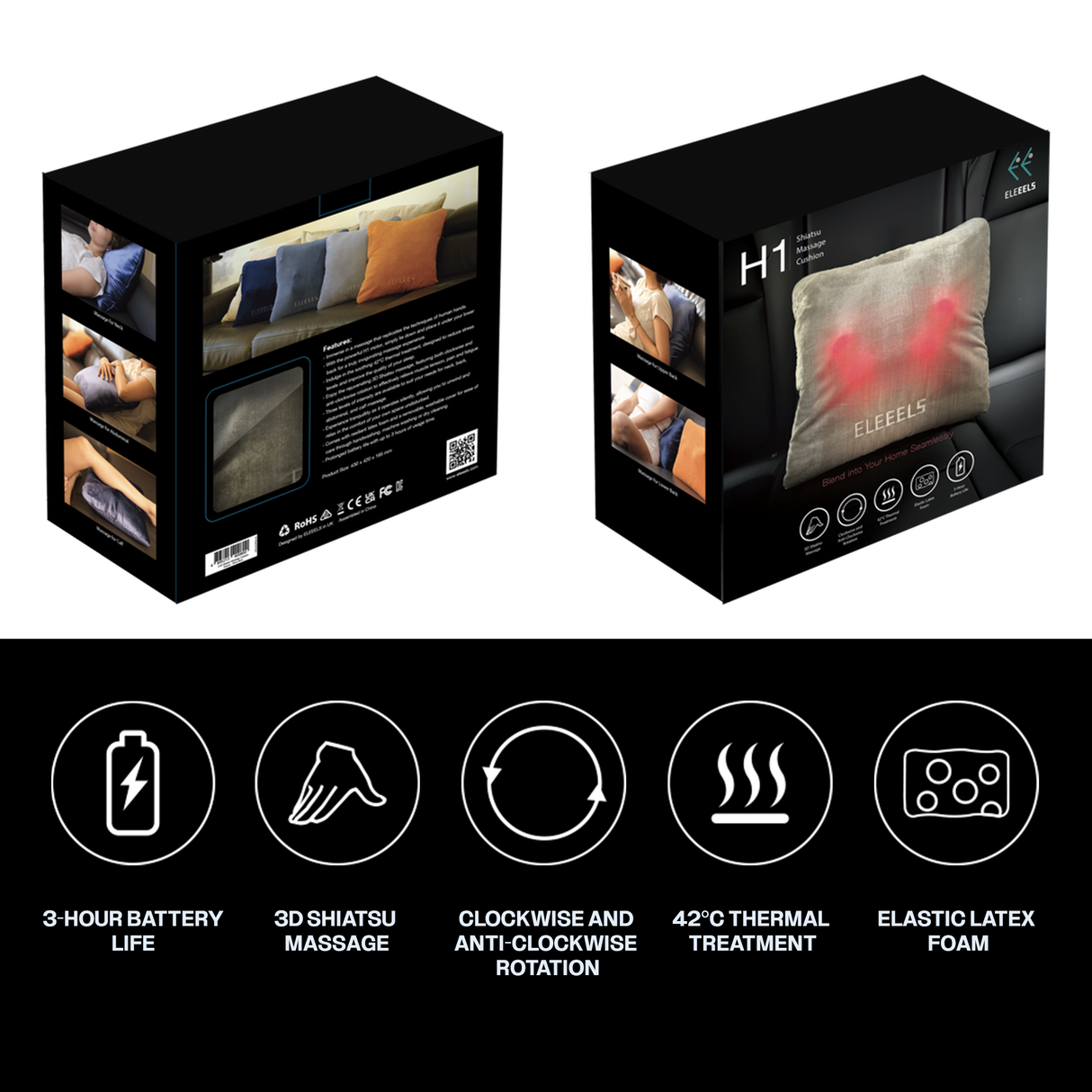 Shiatsu H1 Massage Cushion with Heat by ELEEELS. Features heat therapy, adjustable intensity, and quiet operation. Comfortable latex foam with an easy-to-wash removable cover.FeaturesRealistic Shiatsu Massage Replicates the pressure and kneading of human hands for deep relaxation.3D Dual Rotation Clockwise & anti-clockwise massage heads for complete muscle relief.Powerful Motor H1 motor delivers an invigorating massage experience.42C Heat Therapy Helps reduce stress, improve sleep, and ease tension.Adjustable Intensity Choose from 3 levels to suit your comfort.Quiet Operation Enjoy your massage in peaceful silence.Premium Comfort Resilient latex foam for extra support.Easy to Clean Removable, washable cover suitable for hand wash, machine wash, or dry cleaning.Shiatsu H1 Massage Cushion with Heat by ELEEELS Shiatsu massage cushion with 42C heat therapy, 3D kneading, and adjustable intensity. Quiet operation, latex foam comfort, and washable cover for home relaxation.Shiatsu H1 Massage Cushion with Heat by ELEEELS Shiatsu massage cushion with 42C heat therapy, 3D kneading, and adjustable intensity. Quiet operation, latex foam comfort, and washable cover for home relaxation.