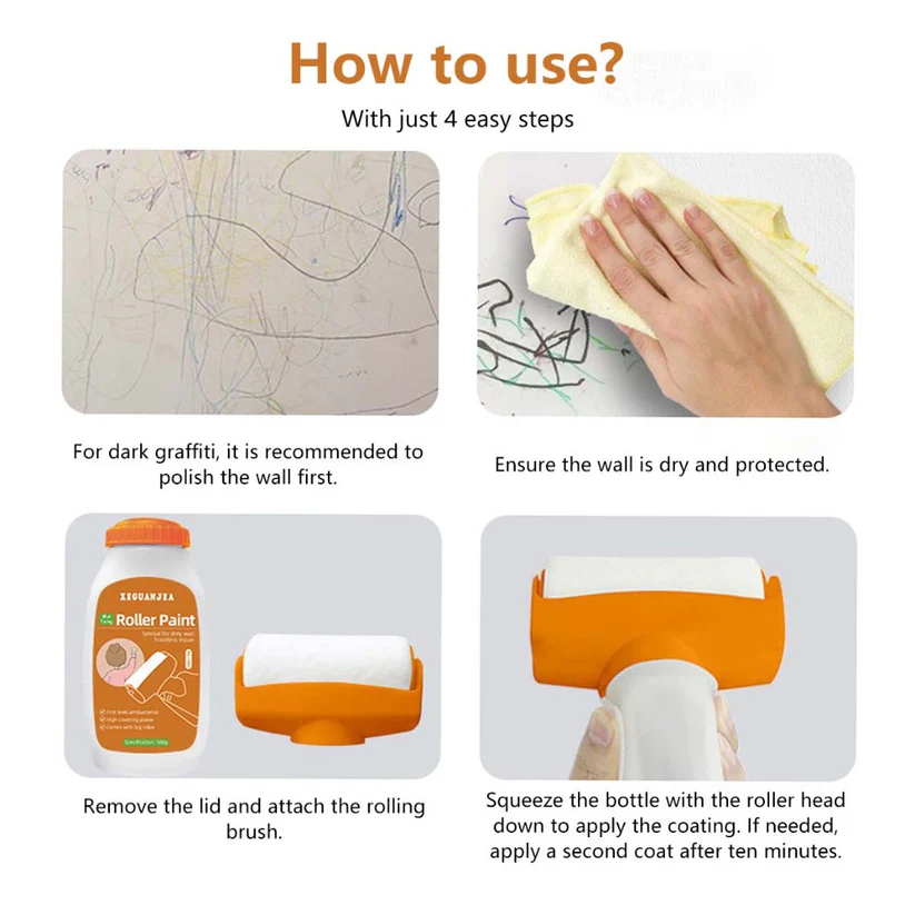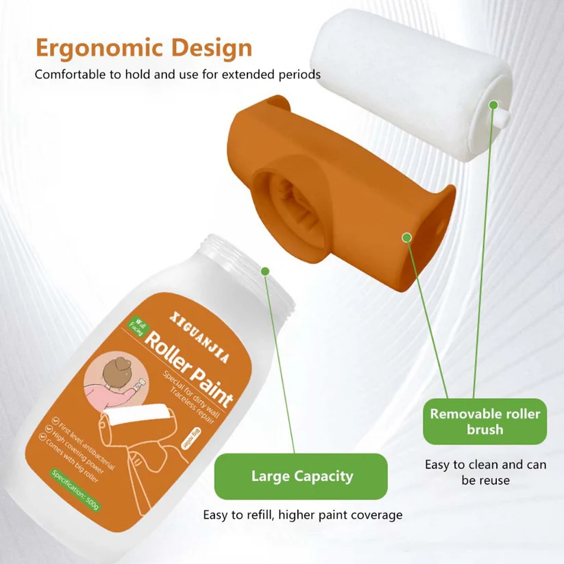 Refresh your walls in seconds with the XIGUANJIA Roller Paint Touch-Up Toola fast, mess-free solution for wall stains, cracks, and surface imperfections. Designed for convenience, this 2-in-1 roller combines high-coverage wall paint with an integrated applicator, making it ideal for quick fixes in homes, offices, schools, or rental properties.Features2-in-1 Wall Paint & Roller DesignSkip the tools and cleanup. This all-in-one solution combines paint and applicator into a single handheld roller, letting you quickly cover up scuffs, stains, scratches, nail holes, graffiti, and more without the mess.Detachable & Refillable Roller HeadThe reusable brush head detaches easily for cleaning or refilling with paint. Environmentally friendly and cost-effective, its designed for long-term use.No Mess, No TracesFormulated with high-covering, low-odor paint, the roller applies smoothly and dries in just 10 minutes, leaving behind no visible repair linesjust clean, fresh walls.Safe & Eco-Friendly FormulaMade with non-toxic, preservative-free ingredients, the paint is safe for children, pets, and chemically sensitive individuals. Use with confidence around your home or workspace.Perfect for Any SpaceWhether it's dirty shoe marks in the hallway, chipped paint in the office, or a child's colorful wall "art," this roller touch-up paint restores your walls to like-new condition quickly and easily.Fix wall stains, cracks, and scuffs instantly with the XIGUANJIA 2-in-1 paint roller. Refillable, eco-friendly, and tracelessperfect for home or office use.Fix wall stains, cracks, and scuffs instantly with the XIGUANJIA 2-in-1 paint roller. Refillable, eco-friendly, and tracelessperfect for home or office use.